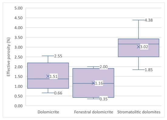 A total of 27 samples were examined, of which 14 samples belonged to stromatolitic dolomite lithology, 7 were dolomicrite, and 6 fenestral dolomicrite. After testing the effective porosity on three types of dolomites, the results were statistically processed and presented in a box and whisker diagram (Figure 5). Stromatolitic dolomite has the highest mean value of effective porosity (3.02%), and fenestral dolomicrite the lowest (1.16%). The diagram (Figure 5) shows that the material of dolomicrite lithology has quite similar values of effective porosity as fenestral dolomicrite.