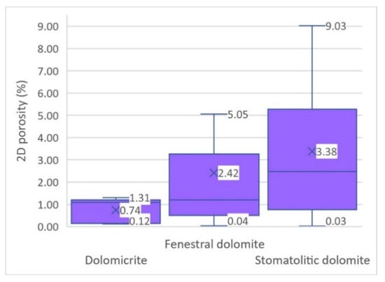 The results of determining 2D porosity are shown in Figure 6. Stromatolitic dolomite has the largest range of values but also the largest mean value (3.38%), followed by fenestral dolomicrite, whose mean value is 2.42%. Dolomicrite lithology has the lowest 2D porosity both in range and in the mean value of 0.74. The diagram (Figure 6) shows a certain difference between the median and the mean value for all examined lithologies, which indicates that the datasets are asymmetric.