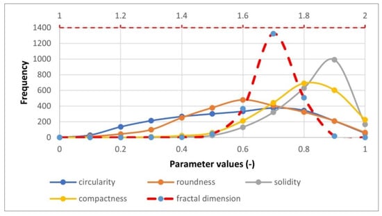 Based on frequency plot analysis of circularity, roundness, solidity, compactness, and fractal dimension (all these parameters ranged from 0 to 1) we can distinguish that these parameters quantify objects’ shapes in two ways: the general shape of the object in the sense of its similarity to the sphere and roughness (or complexity) of the surface of the object. The first group of parameters quantifies the general object’s shape without considering the “small” irregularities of the object surface (i.e., roughness) (Figure 8 and Figure 9). These parameters are circularity and roundness, and correlations between them are proven by frequency plots (Figure 8). The surface roughness or complexity of the shape is an important parameter for assessing the aquifer or reservoir properties. The fractal dimension for most of the pores ranges from 1.6 to 1.8, which indicates a very complex fractal geometry of pores. Changes in pore shape complexity and associated fractal dimension (also other parameters) are visible in Figure 9. Our analysis also showed a strong linear correlation between certain parameters from different groups, such as roundness and compactness (r = 0.99) and circularity and solidity (r = 0.89).