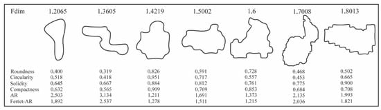 Furthermore, AR and Feret AR changes are visible on the first and third pore examples in Figure 9. Differences of pore shape that result in smallest and largest circularity and roundness are best in the second and third pores in Figure 9. Fractal and multifractal characteristics of the pore structure in deep buried Cambrian dolomites were recognized by the authors of [73]. Fractal dimensions of these dolomites range from 1.36 to 1.680, which also indicate complex pore geometry [73].