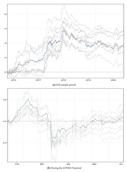 Given that the aim of this study is to examine the connectedness and hedging benefits of cryptocurrencies and investigate financial contagion due to the COVID-19 outbreak, it is imperative to examine the time-varying correlations based on the TVP-VAR method between the selected cryptocurrencies. The results for the full sample period, as well as for the COVID-19 pandemic period only, are presented in Figure 1. From Figure 1a, the time-varying correlation results clearly demonstrate the high value of correlations between cryptocurrencies in early 2018. The reason for this more pronounced connectedness between cryptocurrencies is market uncertainty that arose in early 2018 in response to the sharp collapse of Bitcoin. These findings are in line with Antonakakis et al. [36], who posited that market uncertainty was the main factor for increasing interdependence between cryptocurrencies. From Figure 1b, some interesting facts can be observed: (1) correlations between cryptocurrencies are positive from February to March 2020, with the highest values reached in mid-February 2020; (2) from March to June 2020, the correlations between most cryptocurrencies were negative; and (3) correlations reached minimum values in mid-March 2020. In other words, initially there were positive interdependence between cryptocurrencies but, with the increase in the number of reported COVID-19 cases and deaths, the interdependence became negative. This evidence implies that, at the beginning, cryptocurrencies functioned like a traditional asset but, after the increase in the negative effects of COVID-19, they began acting like a hedge. This evidence is similar to the findings of Demir et al. [16] who argued that cryptocurrencies act like a hedge during periods of uncertainty, but contradicts the findings of Conlon and McGee [31] and Corbet et al. [24] who asserted that cryptocurrencies do not act as hedges or safe havens during periods of economic and financial turmoil but rather function as amplifiers of contagion.