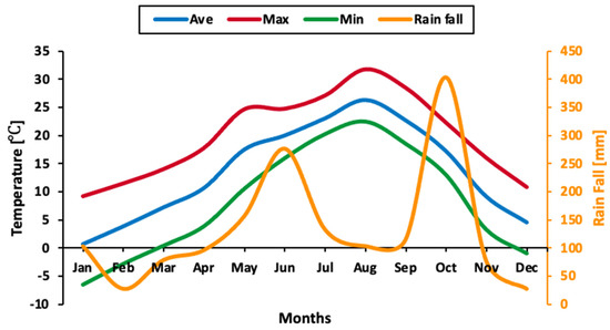 The monthly temperature (average, maximum, and minimum) and rainfall during the monitored period from January 2019 to December 2019.