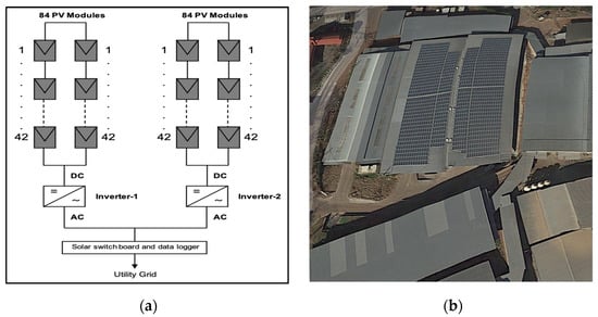 In a PV system, there are different PV array configurations to extract as much as more power output and improve efficiency. The PV array configuration of this study is a series configuration and consists of 168 PV modules with 245 W (each of 245 W capacity). The installation is equipped with two inverters and a data logger that continuously monitor, collect, and store data (voltage, current, and energy generation) at a logging interval of five minutes from inverters. Each inverter is connected to 84 PV modules, and the data is then transmitted from inverters and uploaded to a communication receiver. The energy of the system from inverters is fed into the utility grid and consistently recorded through the data logger over the year 2019. The PV modules are free from any effect of shading and subjected to cleaning twice monthly starting from the beginning of February 2019. The PV modules are fixed with a tilt angle of 30 facing south. The entire PV systems are mounted on metal frames supported by concrete pillars. The PV array specification is shown in Table 3. Figure 4 shows the schematic diagram and a view of the GCPV system in Tochigi, Japan.