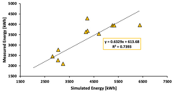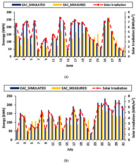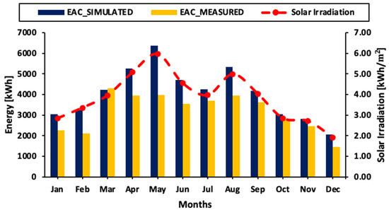 Figure 5 shows the simulated and measured energy of the GCPV system for each month in the year 2019 in correlation with solar irradiation. The analytical model proposed using Equations (1)–(5) described in Section 4 and solar irradiation acquired from PDAV were employed to simulate the energy generation of the PV system.