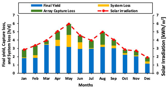 The performance results of the GCPV system are discussed in this section. Figure 7 shows the monthly averaged daily final yield, array capture losses and system losses. The final yield ranged from 1.16 (December) to 3.34 (March) h/d. The monthly averaged daily array losses ranged from 0.43 (March and October) to 1.53 (August) h/d, and the system losses ranged from 0.06 (January) to 1.54 (May) h/d. Figure 8 shows the monthly average daily GCPV system’s final, reference, and array yields over the monitored period. The monthly average daily final, reference, and array yields varied between 1.83 and 1.16 h/d, 2.8 and 1.9 h/d, and 1.9 and 1.4 h/d in January and December, respectively. The annual average daily final, reference, and array yields were 2.59 h/d, 1.91 h/d, and 2.98 h/d, respectively. In general, both reference and final yields are directly proportional to solar irradiation, and a higher reference yield means more solar irradiation.