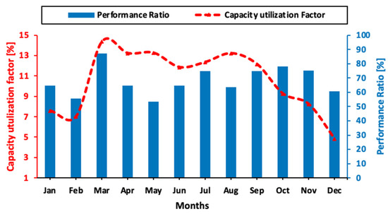 Another performance parameter is the capacity utilization factor (). This parameter corresponds to the ratio between the current energy output and the energy that the PV system would produce if operated for 24 h at full rated power per day [7]. This factor is expressed by the following Equation as given in [37]: