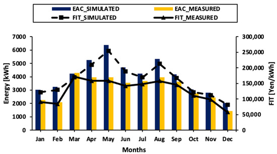 where is the simulated FIT sales price of the PV system, and is the simulated energy. Daily, monthly, and annual FIT sales price by the system can be calculated using Equations (16)–(18):