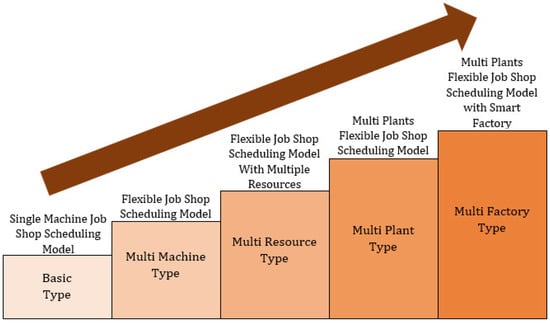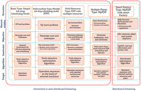 Scheduling can be done based on available resources, assigned jobs, and associated machines. Some review studies [24,25] on scheduling and model structures have analyzed diversified aspects of the scheduling models. The job shop scheduling models can be mainly classified into five types, i.e., performance measures, number of machines, production environment, resource constraint, and processing operations [26]. Based on the literature, JSSP was reclassified into five various types of structures as shown in Figure 3. The basic JSSP problem is an NP-hard problem with a specified operation on a specific machine/machining tool. It is an optimization problem employed to minimize the makespan, maximum lateness, and total weighted tardiness whilst achieving an optimum operation sequence. The Flexible Job Shop scheduling problem (FJSSP) tends to minimize expected makespan and balance the workloads on the selected machines for the optimized solution of an operation sequence [27]. In FJSSP, some or all the machines can be chosen by the algorithm for the desired solution [28]. Both JSSP and FJSSP are frequently used while implementing the algorithms. In Multi resource FJSSP, makespan, cost, and resource consumption are minimized by balancing the workloads [29]. It includes both renewable resources such as machinery and labor, etc., and non-renewable resources such as fuel and material. This type of problem is analyzed either by using disjunctive graphs or by developing the mathematical model [30]. In multi-plant-based FJSSP, multiple plants and transportation among them are also considered while minimizing makespan, costs, tardiness, and transportation distance [31]. This increases complexity and requires high computational power and time to achieve the optimized solution for the operation sequence with selected resources and plants. Due to its dynamic behavior, rescheduling is also required to achieve the optimum solution. The first four structures (i.e., basic type, multi-machine, multi-resource, and multi-plant) models are centralized scheduling models and are not effective for real-time dynamic changes [32]. As all four models are NP-hard problems, the incorporation of the actual dynamics results in increased cost, time and a long recovery period for disruptions in the manufacturing process. To incorporate the disruptions and stochastic environment related to orders, delivery times, machine breakdown, tool failure, and emergency events, etc., smart factory solutions are required in the future. In today’s mass customization and adaptive manufacturing environment, there is a need for smart agents with the features of self-organization and decision making that should be used for scheduling the manufacturing processes. In a smart distributed scheduling problem, the problem is divided into small parallel sub-problems and solved separately either by using a mono or multi-objective approach, using the exact or approximate algorithm. The separated sub-problems simultaneously require less computational time rather than concentrated JSSP to achieve better results.