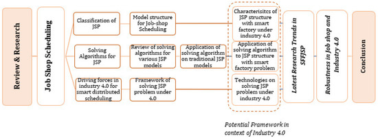 The research on scheduling in the context of Job Shop can be divided into two main categories: (1) problem modeling and (2) problem-solving techniques. JSSP is first classified based on model structures used in the literature. Characteristics of traditional JSSP model structures are analyzed in the context of Industry 4.0. Secondly, the classification and review of algorithms that are used for solving JSSP are done by taking into account both single and hybrid algorithms. Advantages and disadvantages, along with the limitations of the algorithms used in conventional scheduling are analyzed. The challenges of algorithms for using smart distributed scheduling are then highlighted. The driving forces such as IoT, deep learning, AI, cloud computing, and big data are analyzed for smart distributed scheduling. An analysis of the robustness of scheduling in the context of Industry 4.0 is also presented. Figure 2 presents the holistic framework of the research design for this study.