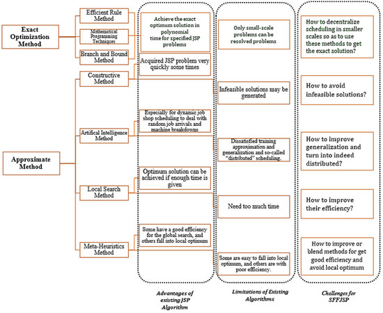 Various algorithms have been employed in the literature for solving JSSP. Both exact and approximate algorithms are classified, compared, and analyzed in various types of JSSP [33,34]. Table 1 and Table 2 enlist some relevant research to classify the algorithms used in the JSSP problem.