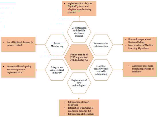 With decentralization taking over the manufacturing industry, flexible manufacturing systems have become a top priority which are smart as well as decentralized, and provide the opportunity to achieve autonomist manufacturing [82]. This approach is unlike the centralized and semi-centralized traditional JSSP. With Industry 4.0 making its shift towards smart manufacturing, the traditional JSSP application is expected to be utilizing smart scheduling along with optimization techniques. In the models based on the futuristic approach, the job, resource, system, and plant objectives are allotted to the smart agents. These objectives act as the prime optimization objective for the smart agents for accessing smart distribution scheduling. Optimization through smart agents is based on distributed optimization algorithm feedback. The feedback is related to predefined parameters, system rules, and objectives. With this decentralized approach, Industry 4.0 has emerged as a pioneer in producing faster and easier operation schedules and sequences with predefined resources [83].