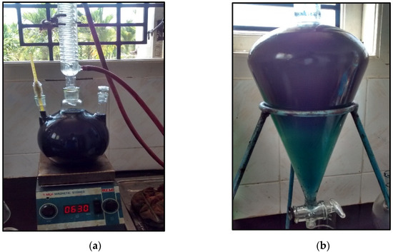 Biodiesel from acid oil cannot be produced directly from the bio-refinery process, as the FFA value is very high. However, it could be produced by reducing the FFA value by using 20% concentration H2SO4 and methanol in a 1:1 ratio. Therefore, the following procedure was followed to produce biodiesel from acid oil. One liter of oil was first transferred into a three-neck flask, as shown in Figure 1a. The three-neck typed bottle was placed on a magnetic stirrer, and the setup was maintained and controlled to 60 °C temperature. One liter of methanol was taken in a separate flask and to it was added 20 mL of concentrated H2SO4. This methanol and H2SO4 mixture was added to the three-neck flask and maintained at 60 °C temperature for three hours stirred at 200 rpm (constant speed). After three hours of continuous heating and stirring, biodiesel was extracted. The obtained biodiesel contained impurities like acid and methanol. The obtained biodiesel was transferred into the washing funnel. It was necessary to rinse and wash it with water. This was done by mixing biodiesel with water of equal proportions. One liter of biodiesel was taken and filled in the washing funnel, and the same quantity of water was filled in the washing funnel and stirred well; it was then permitted to settle down for one day. The water settled below, and the crude biodiesel (acid oil) settled above, as shown in Figure 1b. The water was drained out, and the same procedure was repeated with fresh water two to three times. The crude biodiesel was then taken for distillation.