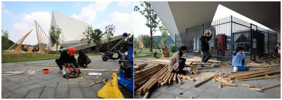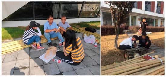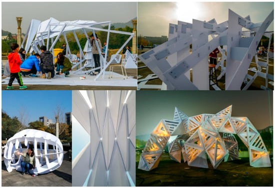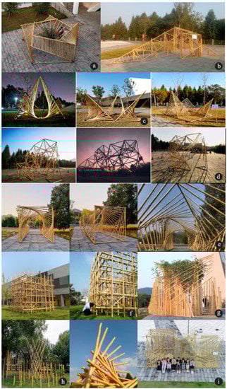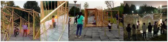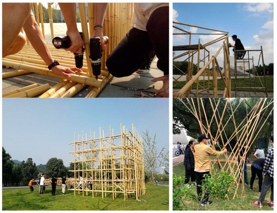 ZUST is a university in mainland China that is famous for cultivating applied talents. Its architecture major is a 5-year program, a typical program length in Asia. Since 2018, the ZUST program has offered an intensive 2-week construction activity course that we developed for first and second year students in the architectural design course. There were 32 students in the initial intensive course offering, and they created 11 structures with cardboard (Figure 2). The dimensions of each structure were 3–4.5 m long, 2–3.8 m wide and 1.8–4.2 m high. In 2019, ZUST signed a school–government coordinated educational cooperation agreement with the Anji government in Zhejiang. The agreement allows the university to design and construct artistic architectural forms using bamboo provided by the government. Judging from the teaching experience of the past year and the success of the cooperation, we plan to continue this construction activity in the architectural design course, with bamboo as the primary material. The ecological and environmental characteristics of bamboo and its renewability [,,] convinced us to fully integrate the concept of sustainability into architectural design teaching. To this end, we designed and created an architectural design pedagogy and teaching method that emphasizes both physical construction using bamboo as a material and the inclusion of sustainable practices during construction.