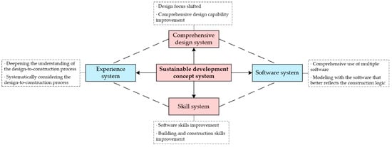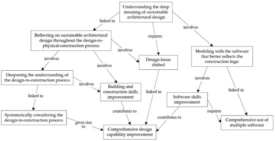 We display the research results via diagrams. This is in line with the grounded theory’s requirement to use diagrams, tables, hypotheses, and descriptions to present research conclusions []. By focusing on the categories established in the coding stage, and adjusting and simplifying the diagram established in the memorandum stage, we developed the structural framework that reflects the characteristics of teaching results (Figure 15). The experience system, which is also the inherent characteristic of “learning from design to physical construction”, is the basic element of this structural framework. The system of sustainability is at the core of this structural framework. It relates to students’ improvement in understanding sustainable concepts and acquiring sustainable knowledge. The system is also connected with the other four systems, which means sustainable ideas can be incorporated with the other four systems and be carried out throughout the entire process of design to construction. The comprehensive design system and skill system are the other two key elements of this structural framework. They are related to our teaching quality and affect students’ improvement of academic knowledge and professional skills. Together with these two systems, the system of sustainability constitutes the backbone of the structural framework. The software system is the supporting element of this structural framework, providing external conditions and technical support for smooth teaching activities. The above five systems integrate concepts and categories into the entire process from design to construction from different perspectives, and promote the integration of knowledge and skills. Through the relationships shown by this structural framework, we find that this structural framework is consistent with our teaching framework in terms of the contents contained. This actually indicates that we have to a certain extent achieved the predetermined goal of integrating the concept of sustainable development into the teaching of architectural design in introductory courses.