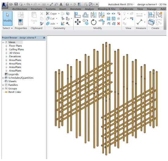In terms of design skills, since sustainability requirements such as improved efficiency and reasonable costs need to be considered at both the design and construction stages, some students used BIM software (Revit) to improve the constructability of the design plan and the accuracy of the design and construction data. These students acquired the skills not only for 2D drawing and 3D visualization modeling, but also for parametric modeling, data management, design and construction parameter optimization, and software combination. Considering the simplicity and efficiency of Sketch Up, students used the software mainly in the conceptual design stage. With Sketch Up, students could quickly conceive design plans, flexibly adjust the volume and form of the design plans, and adapt them to the environment and construction sites. Revit is mainly used in the deepening stage of the design plans, involving the input and management of design and construction data, the modeling of components and nodes (achieved through the Revit Family Function of Revit), and the overall structure optimization of the plans. By using Revit, students coordinated the amount of construction materials used, refined the material processing methods, adjusted and optimized the component parameters, and the connection and logic between nodes. Students were enabled to better consider subsequent construction issues during the plan deepening stage. This helped not only to improve the construction accuracy of the plan, but also to avoid waste caused by blind processing of materials, and rework caused by improper component parameter design and joint connection.