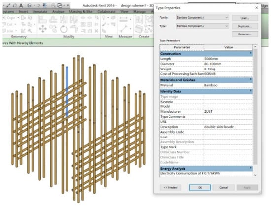 This stage is the stage of expanding the initial conceptual design. Aspects of sustainability incorporated into this stage are primarily the costs of economic sustainability, resource consumption (mainly material utilization) in terms of environmental sustainability, and the design and construction quality as they influence social sustainability. These factors influence architectural design through design knowledge, construction knowledge, knowledge of materials and their properties, material performance, and component processing. At this stage, the student needs to direct their attention to construction-related issues, such as material performance and structural details. At the same time, students need to gain an understanding of methods of processing materials to adapt them to the overall architectural form and the designed structure. We encourage students to use structural analysis software, for example, to determine a suitable architectural structure and from there to investigate and model the mechanical performance of construction materials. However, the students are in an introductory course and lack adequate knowledge of structures and construction, and few of them have prior experience of the software. Revit provides some capability to examine alternative schemes in the structural analysis of architectural forms. Students who use Revit improve the construction logic of buildings and add construction information for components as part of the gradual transformation of an architectural design into a built structure. Revit also tracks the costs of processing construction materials and so the construction costs of a built structure are monitored by Revit (Figure 5). The objective of this stage is to improve the constructability of the design, and the elements of the conceptual design are transformed from space and form to structural details and construction methods. Sustainability is incorporated into architectural design teaching during this transformative process by developing detailed construction-related technical designs.