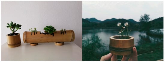 The component processing stage is a stage in which students gain hands-on experience of materials. Sustainability concepts incorporated into this stage are primarily cost issues in economic sustainability and resource utilization (include resource consumption and waste management) and pollution control in environmental sustainability. These factors influence construction principally through the use of construction materials. The learning in the design-to-physical-construction process is important in this stage. Students can experience the texture and characteristics of the materials, as well as learning methods and techniques of working with materials (Figure 6). Students generally lack experience of hands-on working with construction materials and, as a result, encounter difficulties during their initial encounters with the materials in thinking about resource consumption, pollution control, and waste management problems that are related to sustainability. We created a specific lecture-seminar to introduce issues of resource consumption and waste management to guide students in their thinking about these problems and methods. The lecture-seminar had some successful outcomes. Some students tried to control dust pollution from bamboo processing by watering. Some students found ways to utilize the waste produced by bamboo processing through online searching and in conversations with service workers at the host university; two solutions the students found were to use the waste bamboo as a fence for landscape protection, and to turn the bamboo into flowerpots for indoor and outdoor greening and decoration (Figure 7). There is not a single standardized method of material processing, applying traditional techniques, or pollution control. Thus, there is a certain degree of randomness and uncertainty in the teaching and learning of students at this level, and this requires both instructors and students to increase their communication and cooperation to create flexible and efficient solutions to the architectural design and construction problems that the students encounter.