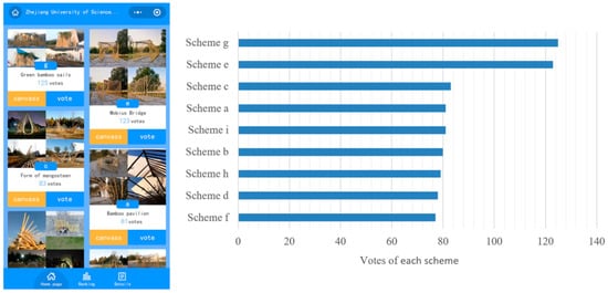 The architectural designs were constructed along the river, in the main landscape area of the campus, which is also one of the most populated areas of the campus. This enabled us to determine the popularity of each structure. We used a platform that is functionally equivalent to Amazon Mechanical Turk to post the completed architectural designs (Figure 10) online for voting to identify the most popular (Figure 11). A total of 807 people, including the general public, voted over three days (one vote per person); students and teachers in the architecture major program and architectural professionals participated in the voting. We hoped the objects would win people’s affirmation, and we encouraged their suggestions for improvement through the poll. We hope more people become aware of sustainable architectural design education and the role of buildings in promoting sustainability. In addition, we also observed the impact of the constructions on enhancing the vitality of the campus. Every day from 4:00 p.m. to 5:00 p.m., the campus is most crowded as students are on their way to their dorms after class, engage in outdoor activities, or take a walk after meals. Therefore, on the 18 no-rain days during the display time (30 days in total), we recorded visitor volume at each site where a construction is located (Figure 12), the behaviors and activities of people at the sites (Figure 13 and Figure 14), and the duration of the behaviors and activities (Figure 14). The data collected revealed that: the visitor volume where the constructions are located has increased, especially at the sites that were rarely visited before; people’s behaviors and activities at the sites became diverse, including having fun and taking photos; the behaviors also lasted longer. Some people were even reading for a long time at the site. This may indicate that the constructions have been accepted by people to some extent. People are willing to come to the site for recreation, and the vitality of campus has thus been enhanced.