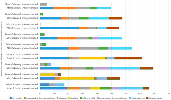 People’s behaviors and activities at the nine sites before and after the nine schemes were constructed and the duration of the behaviors and activities. Notes: Scheme a is located at the inner courtyard of ZUST’s Student Center; Scheme b is at the open space next to the Student Center; Scheme c is on the grassland next to the Student Center; Scheme d is at the open space next to the Student Center; Scheme e is at the open space between the university gymnasium and the Student Center; Scheme f is on the grassland next to the gymnasium; Scheme g is at the open space by the campus lake; Scheme h is located on the grassland by the campus lake; Scheme i is located in the open space next to the Student Center.