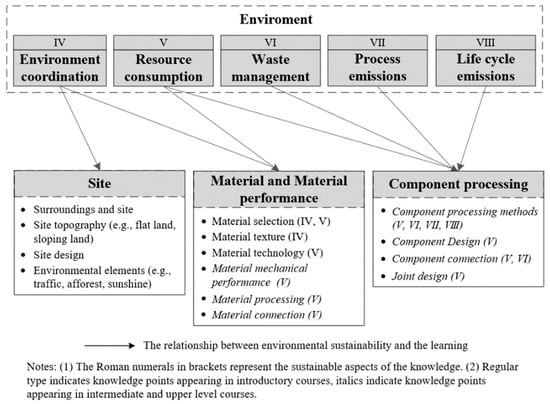 The sustainable architectural design course module that we developed included the learning in the design-to-physical-construction process and introduced sustainable architecture concepts. We intended the teaching to adhere to the most original, essential, and globally recognized understandings of sustainable development to supplement what is considered to be sustainable engineering [] and exploit the full potential of sustainable architectural design and construction. The introduction of definitions and concepts, and the framework of sustainability that they provide, was complemented by the concept of sustainable development presented in the 1987 report Our Common Future []. The sustainable framework established for additive manufacturing [] is well suited for use as a paradigm of sustainability in this architectural design program. This paradigmatic framework was chosen for two reasons: it is, as stated, derived from the most original and essential concept of sustainable development; and additive manufacturing is similar to the design-to-physical-construction process for learning in that both include the need to understand component processing, pollution control, waste management and the like. We took the framework and improved some details to adapt it to our teaching program.
