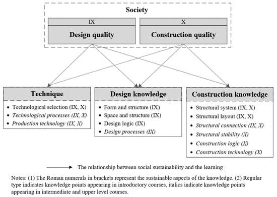 We think the first phenomenon is a way of anticipating architectural design problems and trying to solve the problems; however, it is also a requirement for integrating sustainability into architectural design. It indicates a way of thinking about architectural design problems within the framework of sustainability. It also indicates knowledge preposition, which is the inclusion of knowledge (e.g., construction knowledge) of a later stage in an earlier (design) stage, and positioning knowledge (e.g., of material performance) used in a later stage for use in an earlier stage. Knowledge preposition is explained as part of Bloom’s taxonomy, which represents the process of learning as the transition from using simpler to using more complex thinking skills []. The revised Bloom taxonomy, in the 2001 edition [], includes a cognitive process dimension and a knowledge dimension. Each dimension contains hierarchical levels (Table 2) that are correlated between dimensions. Correlation does not mean that a higher level of cognitive processes necessarily results in more complex knowledge but that an increase in levels in the cognitive process dimension increases opportunities to use or acquire more complex knowledge. In our course, students are expected not only to know, recognize and describe concepts of sustainability but also to comprehend them, apply them in conceptual design, and analyze their characteristics and differences, in order to select and incorporate the appropriate concept into the architectural design. Our pedagogy, therefore, according to Bloom’s taxonomy, involves at least remembering, comprehending, applying and analyzing, which means that this course is more likely to involve more professional knowledge in contrast to a course with only a single level or a few levels of cognitive processes. For example, the introduction of knowledge used in a later stage of design into an earlier stage, and the introduction of higher program level knowledge to a lower program level, are forms of knowledge preposition. With an intention to predict the potential for sustainability to act as a bridge to facilitate the transfer of academic knowledge between higher and lower program levels, we tried to identify relationships between sustainability and more detailed design skills and between sustainability and more detailed architectural knowledge (Figure 16, Figure 17 and Figure 18). The potential was revealed by feedback from a student: