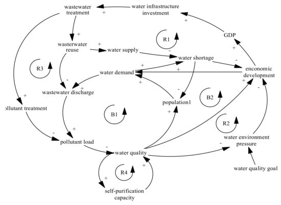 After determining the scope and boundary of the model, the interactions between the four main boundaries of population, economic activities, water supply and demand, and water environment were analyzed. We established a causal-loop diagram for water quality, as shown in Figure 3. The main causal loops in the model causal-loop diagram were based on the following logic: