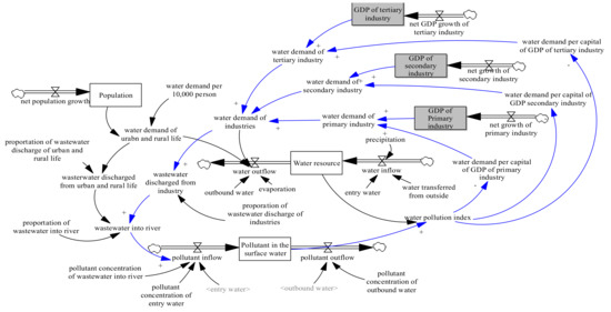 The research objective was to provide an experimental simulation platform for the analysis of these strategic problems in their interconnected context through building an SD model to investigate the feedback process and interaction among the population; water resources; and primary, secondary, and tertiary sectors; and discuss the causal relationships between water quality and industrial-structure adjustment. The water-quality system includes the population subsystem, water-resource subsystem, economic sector (primary, secondary, and tertiary sector) subsystem, and water-environment subsystem (Table 1).