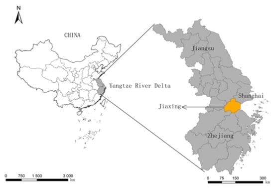 Jiaxing is located in the northern part of Zhejiang Province, eastern China. Jiaxing is in the center of the economically dynamic Yangtze River Delta region, and is situated on the railway between Hangzhou and Shanghai. It is joined to the dense waterway network that serves the northern Zhejiang plain (Figure 5). The location is at longitude 120.8106° E and latitude 30.7539° N. It covers an area of 4230.05 km2.