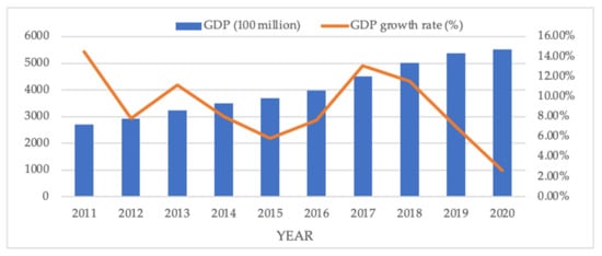 GDP and GDP growth rate of Jiaxing City (source: 2011–2020 Jiaxing national economic and social development statistical bulletins).