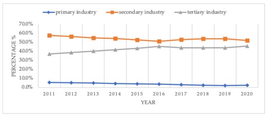 Value added (% GDP) of the three sectors in Jiaxing City (source: 2011–2020 Jiaxing national economic and social development statistical bulletins).