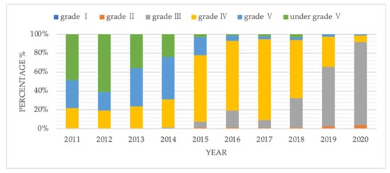 Jiaxing City is located in the lower reaches of Taihu Lake Basin, which is a typical plain river network area. There are many rivers and lakes in the area. The total length of the rivers is 13,805 km, and the water area is 273.24 km2. Among them, there are 57 main rivers with a total length of 959 km, and 66 lakes with an area of more than 10,000 m2. The total water area is 38.29 km2, with a water area ratio of 7.96%, and a river density of 3.5 km/km2. Since the end of the 20th century, the economy of Jiaxing has developed rapidly, and the five counties (cities) under its jurisdiction have entered the ranks of the top 100 counties in the country. However, the quality of surface water has obviously deteriorated. On the one hand, because it is located at the end of Taihu Lake Basin, it is obviously affected by the water quality. On the other hand, it is also affected by the endogenous pollution brought by economic development, and the surface water quality is deteriorating. Since the end of the 20th century, due to the economic development, the surface water quality of Jiaxing has deteriorated year by year [36], and the main water bodies in the region are inferior to grade V in 2010. Since the 12th Five Year Plan, with the implementation of pollution reduction and other measures, the deterioration trend has been curbed, and the surface water environment is slowly improving. At the end of 2020, the city’s total water resources were 4.217 billion m3, and the annual average precipitation depth was 1640.7 mm (equivalent to 6.929 billion m3 of precipitation). Among the 73 city-controlled sections, a water quality of grade III and above accounted for 91.8%, an increase of 26.0% from the previous year. A water quality of grade IV accounted for 6.8%, and the water quality of grade V accounted for 1.4% (Figure 8). In general, during the 13th Five Year Plan period, the water-environment quality of Jiaxing City has been improved significantly, and the comprehensive improvement effect is remarkable. However, the water quality is still not meeting its expected standard. Further efforts to improve the water quality will be more difficult. This challenge is representative in many ways of other Chinese cities.