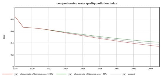 Sensitivity analysis is an important task for the reliability of simulation results due to the uncertainties embedded in parameters of SD models. This analysis can be used to ascertain model response to uncertain changing of industrial-structure adjustment and identify influential parameters affecting water quality. We selected nine parameters related to the change in industry proportion for carrying out a sensitivity analysis of the complex system: three parameters that were associated with primary industry (change rate of farming area, change rate of LPB GDP, change rate of aquaculture GDP), three that were related to the secondary industry (change rate of TI added value, change rate of PPP added value, change rate of RCMCP added value), and three related to the tertiary industry (change rate of WRS added value, change rate of ACS added value, change rate of CSE added value). Figure 9 gives the sensitivity analysis of “the change rate of farming area” as an example. The sensitivity analysis indicated that the curves obtained were consistent with the original trends.