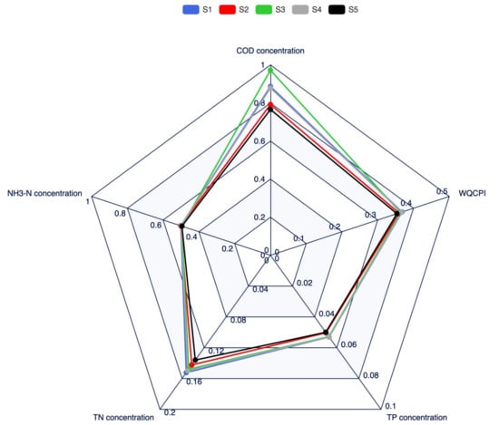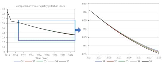 The simulated WQCPI of surface water in Jiaxing City is shown in Figure 10. Under the current industrial structure and economic development mode, the quality of the surface-water environment in Jiaxing City will be significantly improved and achieve a subcleanness level. Specifically, the comprehensive pollution index of the surface-water environment decreased rapidly from 2021 to 2030, and decreased slowly from 2031 to 2035. By 2035, the comprehensive pollution index of water environment will drop to about 0.37, with COD, NH3-N, TN, and TP concentrations in Jiaxing’s surface water of 0.89, 0.5, 0.15, and 0.05 mg/L, respectively. Compared with the base mode, the other four alternative scenarios pushed the CWQPI curve downward at different levels, which meant the adjustments of industrial structure could promote the improvement of water quality, especially in reducing COD concentration (Figure 11). Among the four policy designs of industrial-structure optimization, collaborative optimization of three industries (S5) was the most effective in improving water quality, indicating that transformation and upgrading of the three industrial structures would be the most beneficial and most efficient measure to promote sustained development of Jiaxing City’s water environment. However, the simulation results also indicated that this effect was limited, and cannot help Jiaxing’s water quality achieve breakthrough.