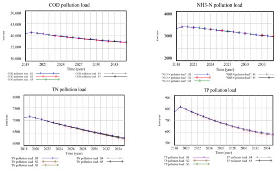 Figure 12 gives the simulation results for COD, NH3-N, TN, and TP pollution loads from socioeconomic activities between 2018 and 2035 under different scenarios. Four pollutant-loading trends behaved in the same way. Pollutant discharged from socioeconomic activities will gradually decrease after a temporary increase in 2019. Taken as a whole, industrial-structure adjustments had positive effects on reducing pollutant load. They can especially contribute to the reduction of COD and TP discharges.