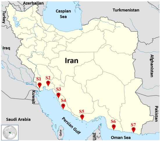 Location of seven stations across the southern coasts of Iran, under study (credit: [13], raw map from “Map data ©2019 Google”).