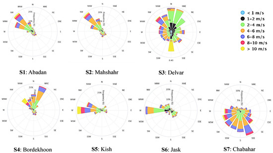 For the purpose of the current study, seven coastal stations are selected and investigated (Figure 2). The reason for selecting these stations is that in the first place, the Renewable Energy and Energy Efficiency Organization of Iran (SATBA) has provided public access to validated wind speed and direction data for several stations in Iran [46]. Some of these stations are nearshore and some are not. Since the case study has been on the southern coasts of Iran, which comprises four provinces: Sistan and Baluchestan, Hormozgan, Bushehr, and Khuzestan, in each of these provinces, the nearshore stations with available validated information are selected to cover the whole southern shoreline of Iran from east to west. Hence, these stations have been selected. Table 2 shows some descriptive statistics of wind speed data in each of the seven stations including Latitude (Lat.), Longitude (Long.), data period, time interval, total recorded data, mean wind speed, standard deviation (Sd), maximum wind speed (Max.), locations and the data specifications for each station. According to Table 2, Chabahar (S7 station) has the highest mean wind speed with a value of 4.97 m/s, and therefore it has a great potential for harnessing wind energy.