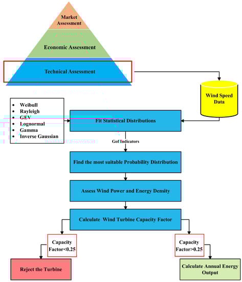 Figure 4 shows the flowchart of this study. The initial step for any wind power feasibility study is the technical assessment. The vital part of the technical assessment is to study and analyze the statistical characteristics of wind speeds because the energy output of the field considerably depends on wind speeds and their patterns. Various studies asserted that the main part of the assessment is finding the PDF through wind speeds data as the main input into wind turbine design, station planning and operational plan [52]. After finding a suitable distribution, wind energy potential can be determined. The next step is to calculate the wind turbine capacity factor for all available options. If the capacity factor is less than 0.25, the selected turbine model is rejected. Else, it is selected as a potential option and annual energy output is calculated for it [53].