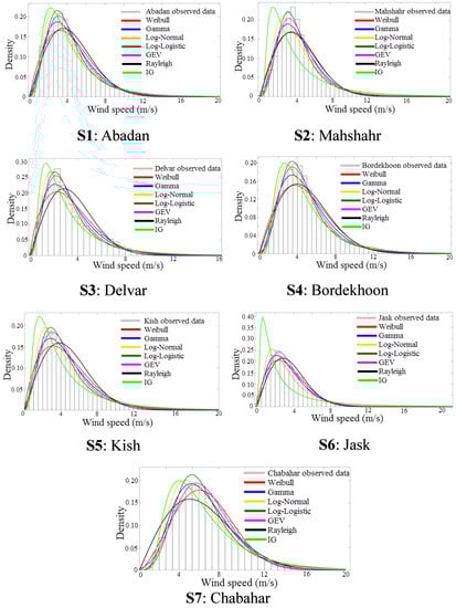 The wind speed distribution diagrams (PDF plots) for seven selected stations are shown in Figure 6. The horizontal axis of these diagrams shows the range of wind speed and the vertical axis is the probability density. It varies from zero to the highest possible value for each curve. As seen in figures, all distributions are skewed to the right (i.e., positive Skewness), and therefore, the mean of wind speeds is bigger than the mode and median of data.
