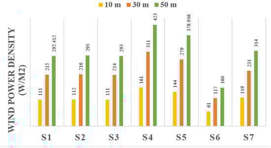The wind power density for each station is determined using the best-fitted probability distribution at 10, 30 and 50 m above the ground. Once the wind power density is calculated, wind energy density can be found. In this study, wind energy density is computed for one year. The results are gathered in Table 9. For the sake of comparison, wind powers for each height across the stations are shown in Figure 7.