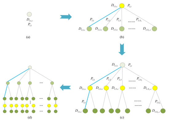 The scenario tree. The structure of the scenario tree is based on a unique parent node, branching to form multiple child nodes. The child node is then set to the parent node and branch to form multiple successor child nodes, until the end of the decision time period. How we obtained the scenario tree presented in Figure 2a–d is described as follows. Each scenario tree contains several future scenarios, and each path formed by the parent node-child node connection represents each scenario (blue line in Figure 2). Each scenario has specific values and probabilities, which indicate the value of the demand and the probability of its occurrence. For a certain decision time period, the demand has several values and corresponding probability, which can be regarded as the discrete probability distribution of the demand. By traversing every scenario in the scenario tree, the uncertain demand can be transformed into the value and probability of several deterministic scenarios. Then, the uncertainty of demands can be described.