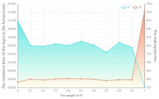 In order to show the trend of the objective function value changing with the weight more clearly, in Figure 4, the horizontal coordinate represents the weight of the objective function , that is, the value of the objective weights , correspondingly, . The left vertical coordinate represents the residence time of the ingot in the furnace (environmental dimension index), the right vertical coordinate represents the makespan (economic dimension index), the blue solid line represents the average value of the objective function of the 10 experiments, and the orange solid line represents the mean value of the objective function of 10 experiments.