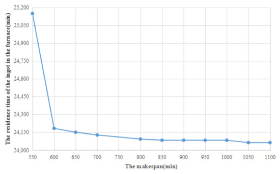 The following can be observed in Figure 5. Firstly, as the makespan increases, the residence time of the ingot in the furnace first shows a downward trend and then remains stable. Secondly, when the min and the min the makespan increased by 50 min and 100 min, respectively, whereas the residence time of the ingot in the furnace decreased by 966 min and 56 min. Overall, the appropriate relaxation of the makespan can impose a significant decrease on the residence time of the ingot in the furnace, so considering the trade-off between environmental and economic dimensions in the light of practical demands is necessary. Thirdly, when the min, min, min and min, the makespan increased by 150 min, 150 min, 50 min and 50 min, respectively, whereas the residence time of the ingot in the furnace decreased by 44 min, 0 min, 20 min and 0 min. Therefore, even though the requirements for the makespan are relaxed, the residence time of the ingot in the furnace only has a slight reduction. At this point, the optimization of the makespan should be highlighted. Fourthly, the residence time of the ingot in the furnace remains stable when the min. However, why did the residence time of the ingot in the furnace decrease by 20 min when the min? When the makespan is increased to about 1050 min, the production scheduling is changed from a single decision time period to a two-decision time period, which results in a slight decrease of the residence time of the ingot in the furnace. Similar examples can be found in Figure 6.