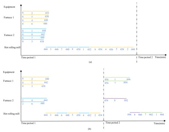 The following conclusions can be seen. First, in experiments 3–10 in Table 5, the comparison between the rolling horizon and a single decision time period show that the objective function value of the former () is slightly larger than that of the latter, while the objective function value of the latter () is much larger than that of the former. The value of the objective function of the former () obtained is better than that of the latter, and the mean value of the objective function () is reduced by 100 min, which verified that the scheduling in rolling horizon can globally optimize the production in the aluminum furnace hot rolling section while satisfying the constraint conditions and is more conducive to the sustainable development of the environmental and economic dimensions. Second, Figure 6a,b show the scheduling schemes in rolling horizon or a single decision time period, respectively. This example can illustrate in detail that scheduling in the rolling horizon is better than scheduling in a single decision time period. Compared with Figure 6b, it can be seen from Figure 6a that, assuming the capacity constraint conditions of the furnace are satisfied, when the ingots 1, 7 and 8 that should have been processed in the decision time period 2 are processed in the decision time period 1, the total makespan is reduced from 904 min to 460 min, and the total residence time of the ingot in the furnace is increased from 3523 min to 3528 min. In general, the overall indicators of environmental and economic dimensions can be effectively optimized.
