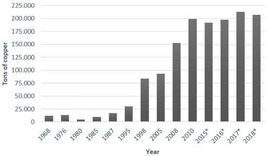 - Pascual, P. La industria del cobre en España II. De 1976 a 2005. Hist. Ind. 2008, 38, 115–159. [Google Scholar]