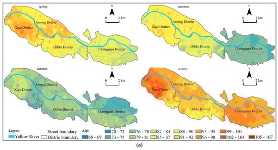 Air pollution forms an obvious spatial process of clustering–diffusion with seasonal changes (Figure 4a). The hot spot in spring and summer is Xigu District, and the cold spot in Anning is Chengguan District. Great changes take place in the hot spot areas in autumn and winter. The hot spot area in autumn is mainly concentrated in Xigu District and the central areas of Qilihe and Chengguan Districts, while the cold spot area is mainly concentrated in the mountainous part of Qilihe and along the river in the northern part of Chengguan. In winter, two hot spots are formed in Xigu and Chengguan, and Qilihe is a cold spot area (Figure 4b). In the spring, the AQI of the whole city is between 80 and 97.