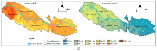 Two moderately polluted areas, Xigu District with mainly industrial emissions and Chengguan District with mainly heating emissions, have formed, with an AQI of over 95. A surface pollution area formed in Chengguan dominated by Zhangye Road, Guangwumen, Jiuquan Road, Gaolan Road, Wuquan, Railway East Village, Railway West Village, and other streets. The main reason is that 56.5% of heating stations are gathered in Chengguan. Boilers emit large amounts of dust and SO2, forming low-altitude non-point-source pollution [69]. The air quality in Anning and Qilihe Districts is relatively good, and the AQI is basically between 90 and 95. Even marginal areas have low values, such as Chenping Street in the east of Xigu and Pengjiaping Town in Qilihe.