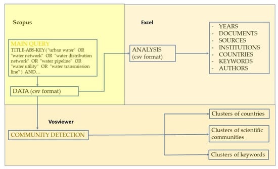 The search was conducted using the fields TITLE, ABSTRACT, KEYWORDS to scientific publications related to the challenges water utilities are facing in their operation. The search was limited to the period from 2000 to 2020. All the output information was downloaded from the Scopus database and analyzed using Excel to determine publication trends, sources of information, institutions, countries, main keywords, and authors in this research field. Moreover, the information was also treated in the Vosviewer software, specially developed for these kinds of analysis [], to locate clusters of countries, scientific committees, and keywords. Figure 1 shows the work methodology employed in this research. The search string introduced in the Scopus database is the following: