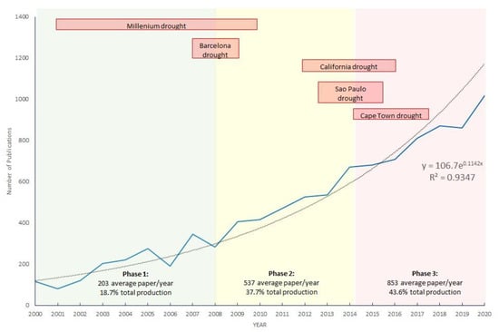 One of the factors which could explain this increasing tendency over the last years is the exceptional drought events affecting largely populated areas that have occurred since the beginning of the century. Some of the biggest cities of the world have suffered long unprecedented drought and water shortage periods, which have had a huge impact not only on the water utilities operation and performance, but have also generated economic losses, disruption of social networks, and health damages []. In order of occurrence, the major droughts have been: Melbourne underwent a long millennium-heralded drought from 2001 to 2009 []; Barcelona suffered water scarcity from 2007 to 2008 when water had to be taken to the city from new distant water sources []; the California area experienced water scarcity from 2012 to 2016, being 2014 the most severe in the last 1200 years []; the Sao Paulo region had to apply water restrictions to near twenty million people between 2013 and 2015 []; Cape Town underwent a major drought from 2015 to 2018 [] when the population started to talk about “Day Zero”, the day when the city would run out of water []. These are the largest droughts that occurred since the beginning of the century, but not the only ones. In total, 79 droughts in large cities have been identified in the first twenty years of the current century []. Two main conclusions are obtained from this graph; exceptional drought events are happening more frequently in the last years and scientific publications are increasing as these events happen.