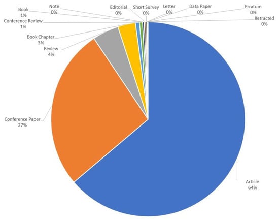 The type of publications has also been analyzed. Figure 3 shows the percentage of documents according to the type of publication. Most of the publications are articles in scientific journals (64% of the total) and conference papers (27%). The rest of the types of publications, reviews, book chapters, and conference reviews represent a small percentage of the total. The contribution to the total amount of other types of publications, such as books, editorials, and letters is negligible.