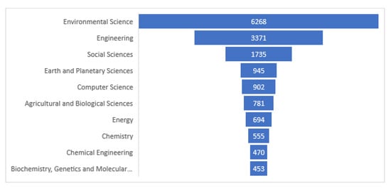 The Scopus database shows a total of 28 subject areas for the publications on challenges associated with WDN. Figure 4 shows the subject category where documents have been published, according to the Scopus database, for the top ten subject areas. The main subjects in order of appearance are Environmental Science, Engineering, Social Sciences, Earth and Planetary Sciences, and Computer Sciences. The contribution for the rest of the subject areas is reduced.